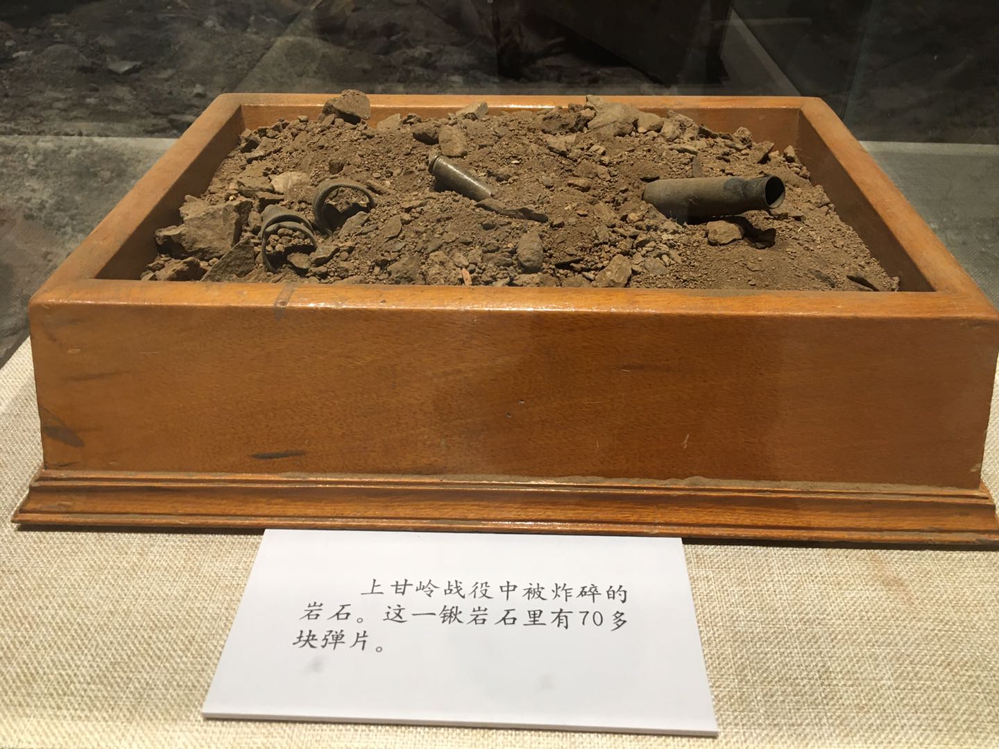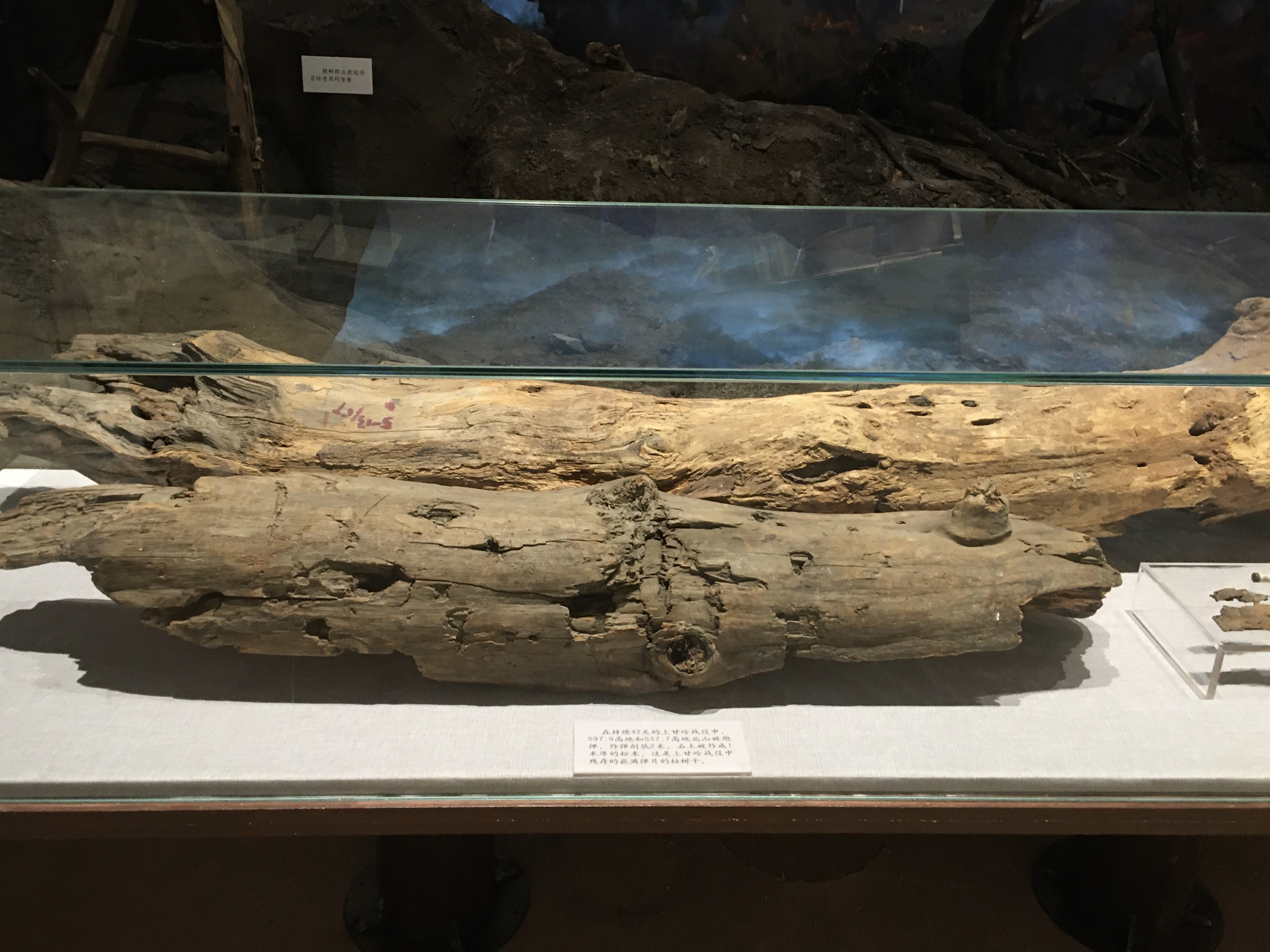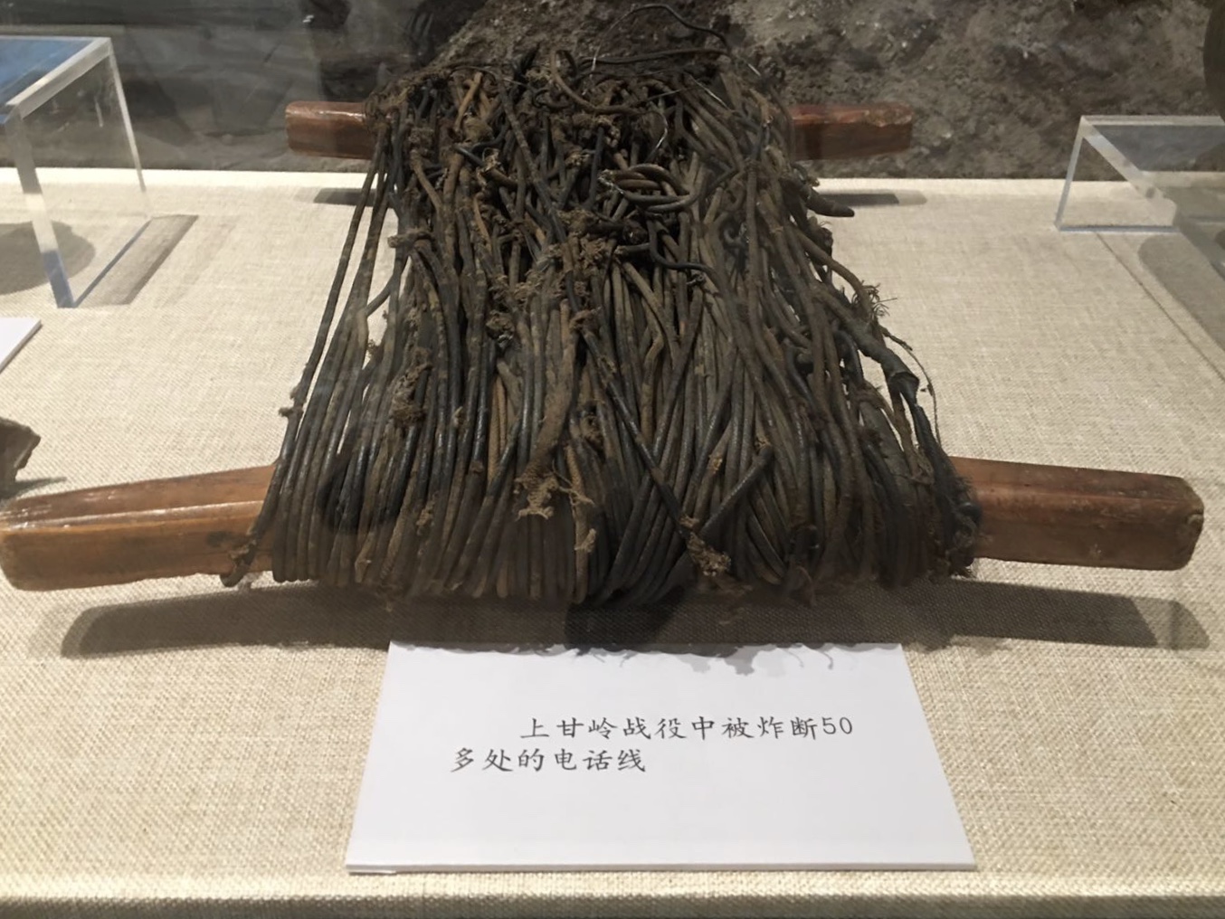 在軍博的主題展覽“血戰(zhàn)上甘嶺”展區(qū),幾件戰(zhàn)場(chǎng)實(shí)物似乎還能讓人聞到當(dāng)年的殘酷硝煙:一截嵌滿彈片的枯樹(shù)干,一堆摻雜著彈片的碎石焦土,被炸斷50多處的200多米電話線……