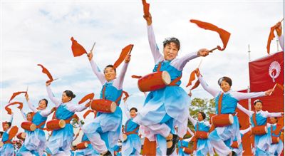 山東榮成市民文化活動(dòng)公園,1000多名當(dāng)?shù)厝罕娗闷鹧?,共同抒發(fā)走向全面小康生活的幸福與美好。 |