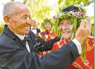 浙江省湖州市長(zhǎng)興縣夾浦鎮(zhèn)長(zhǎng)平村“歲月述金婚”活動(dòng)現(xiàn)場(chǎng),楊水良(左)為妻子楊富元佩戴愛(ài)的花環(huán)。 |