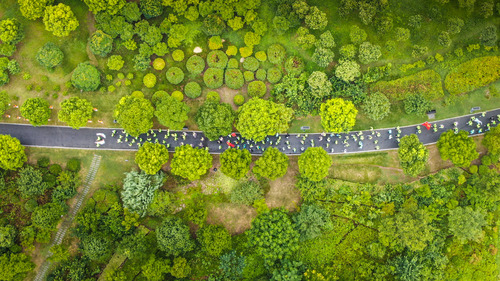 在江蘇省淮安市,體育愛(ài)好者在淮安森林公園進(jìn)行“全民健步走”活動(dòng)(8月7日攝,無(wú)人機(jī)照片)。新華社發(fā)(干石泉 攝)