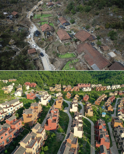 拼版照片上圖:這是整屯搬遷前的廣西南丹縣里湖瑤族鄉(xiāng)董甲村么干屯(2018年1月10日攝)。村民們都搬遷到“千家瑤寨·萬(wàn)戶瑤鄉(xiāng)”里湖王尚易地扶貧搬遷安置點(diǎn)。下圖:這是廣西南丹縣“千家瑤寨·萬(wàn)戶瑤鄉(xiāng)”里湖王尚易地扶貧搬遷安置點(diǎn)(8月4日攝,無(wú)人機(jī)照片)。新華社記者 周華 攝