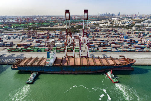 10月27日,一艘貨輪??刻旖蚋邸L旖蚋奂瘓F(tuán)正式開(kāi)通運(yùn)營(yíng)今年第四條“一帶一路”新航線(無(wú)人機(jī)照片)。新華社發(fā)