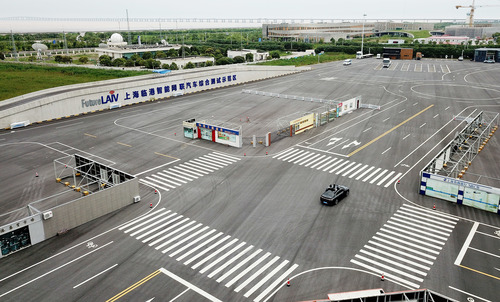 測試車輛在上海浦東新區(qū)臨港智能網(wǎng)聯(lián)汽車綜合測試示范區(qū)內(nèi)進行行駛測試(7月3日攝,無人機照片)。新華社記者 方喆 攝
