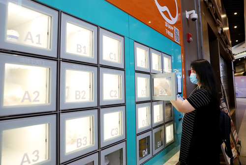 一位顧客通過APP掃碼,在上海地鐵13號線世博會博物館地鐵站附近的一家盒小馬服務點取餐柜中拿取預定的早餐(7月17日攝)。新華社記者 方喆 攝