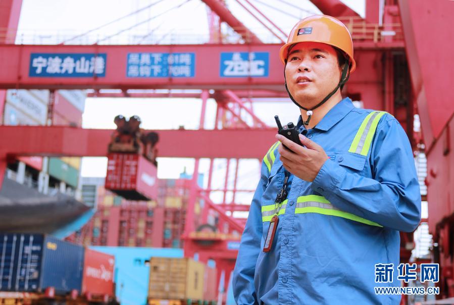 寧波舟山港北侖第三集裝箱碼頭有限公司橋吊班大班長竺士杰在寧波舟山港碼頭工作(資料照片)。新華社發(fā)