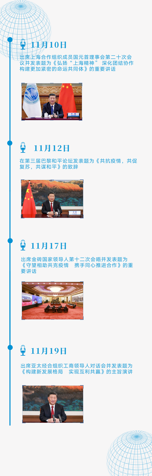 11月10日至22日,不到兩周時間,習主席以視頻方式出席4場多邊會議、一場國際論壇,發(fā)表8場重要講話、主旨演講和致辭,外交日程異常密集。