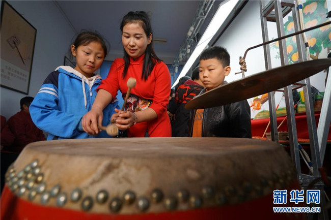 11月24日,皮影戲藝人在河北省沙河市西油村小學指導學生打鼓。新華社記者 范世輝 攝
