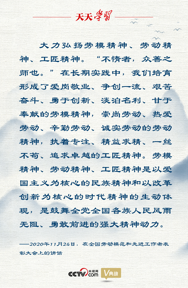 在講話中,習(xí)近平總書記還用“不惰者,眾善之師也”這句古語(yǔ),深刻詮釋勞模精神、勞動(dòng)精神、工匠精神的實(shí)質(zhì),指出勞模精神、勞動(dòng)精神、工匠精神是以愛國(guó)主義為核心的民族精神和以改革創(chuàng)新為核心的時(shí)代精神的生動(dòng)體現(xiàn),是鼓舞全黨全國(guó)各族人民風(fēng)雨無(wú)阻、勇敢前進(jìn)的強(qiáng)大精神動(dòng)力。