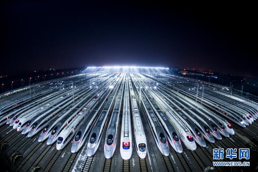 動(dòng)車(chē)組??吭谖錆h動(dòng)車(chē)段的存車(chē)線上,準(zhǔn)備進(jìn)行檢修和保溫作業(yè)(2018年2月1日攝)。新華社記者 肖藝九 攝