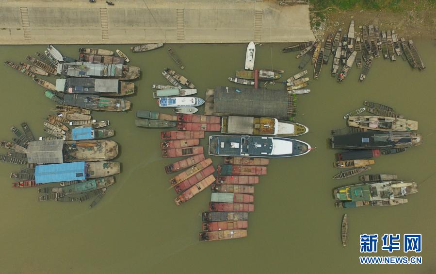 在湖南常德漢壽縣蔣家嘴鎮(zhèn),待回收的鐵漁船停靠在洞庭湖邊(2019年12月17日攝,無(wú)人機(jī)照片)。2020年1月1日零時(shí)起,長(zhǎng)江流域332個(gè)自然保護(hù)區(qū)和水產(chǎn)種質(zhì)資源保護(hù)區(qū)全面禁止生產(chǎn)性捕撈。新華社記者 薛宇舸 攝