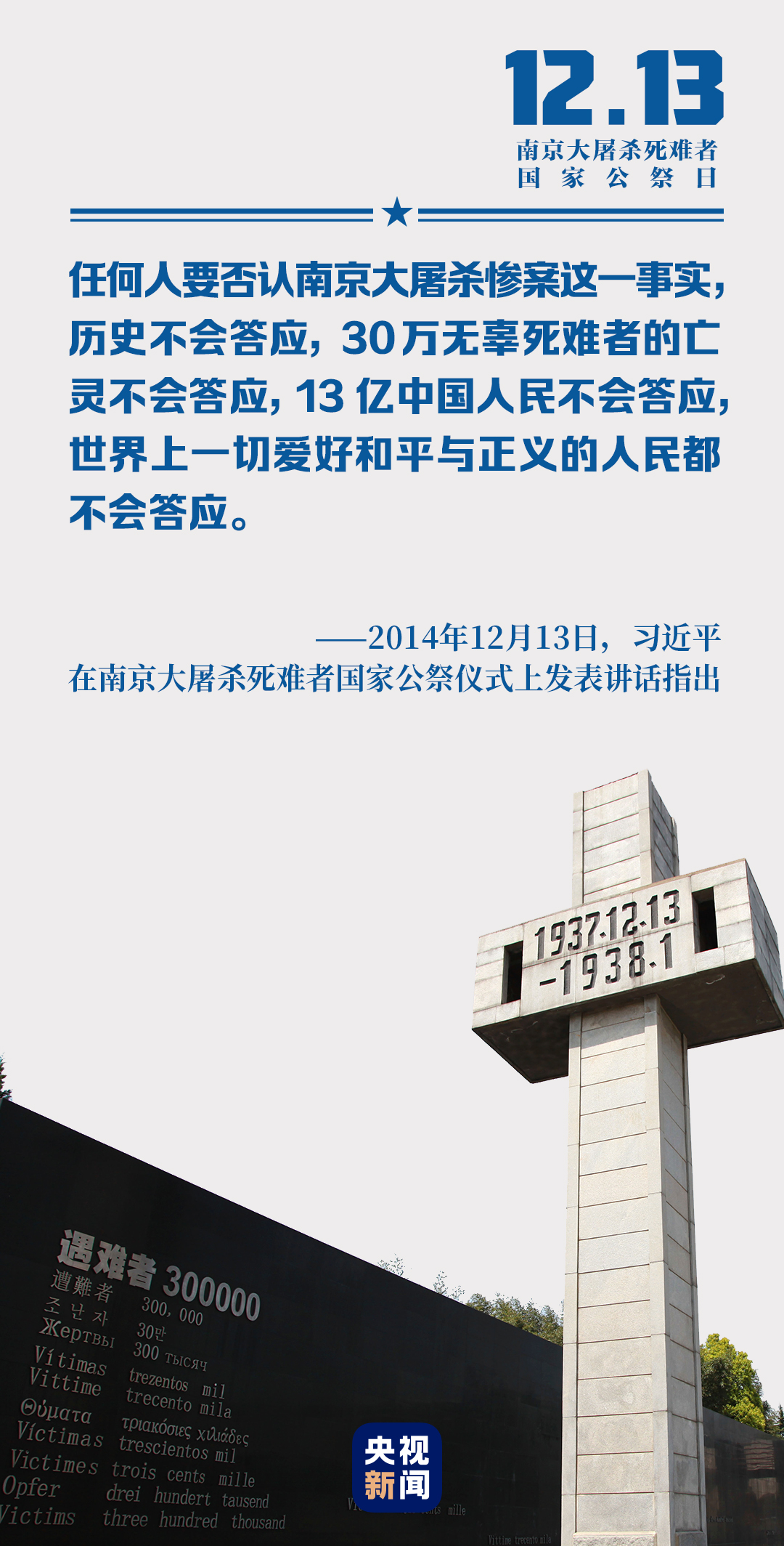 這既是一個(gè)飽經(jīng)滄桑的國家對死難同胞的隆重祭奠,是一個(gè)走向復(fù)興的民族面對昔日傷痛的深刻思考,也是向世人宣示,中國人民反對侵略戰(zhàn)爭、反對篡改歷史的立場堅(jiān)定不移,中國人民團(tuán)結(jié)一心實(shí)現(xiàn)民族復(fù)興的決心堅(jiān)定不移,中國人民捍衛(wèi)人類尊嚴(yán)、維護(hù)世界和平的意志堅(jiān)定不移。