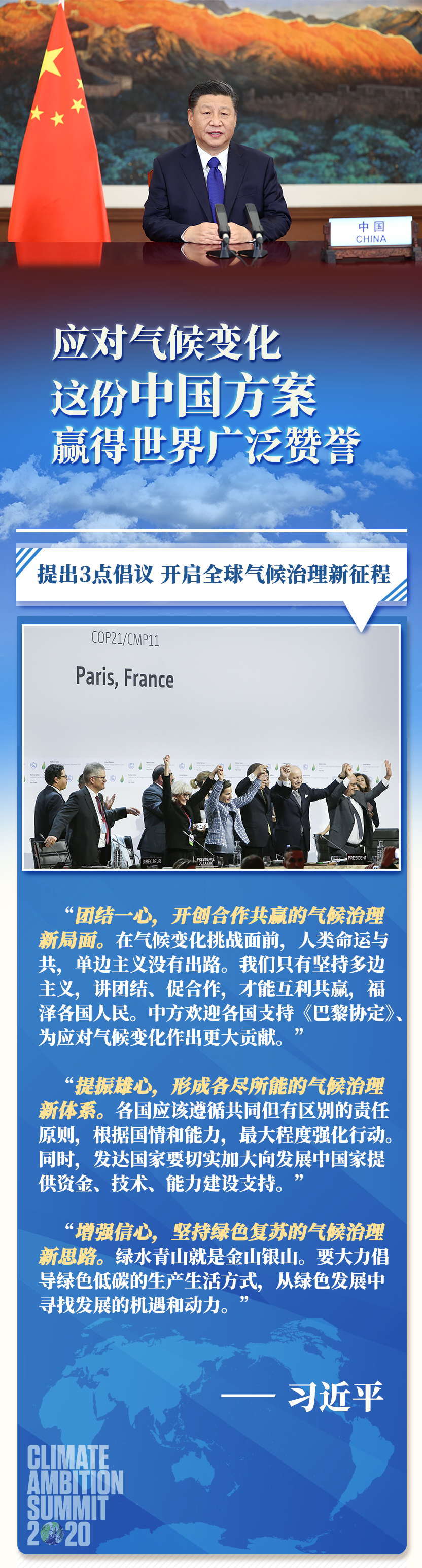 12月12日,習(xí)近平主席在氣候雄心峰會(huì)上通過(guò)視頻發(fā)表題為《繼往開(kāi)來(lái),開(kāi)啟全球應(yīng)對(duì)氣候變化新征程》的重要講話,闡釋?xiě)?yīng)對(duì)氣候變化的中國(guó)主張,宣布中國(guó)國(guó)家自主貢獻(xiàn)最新舉措。