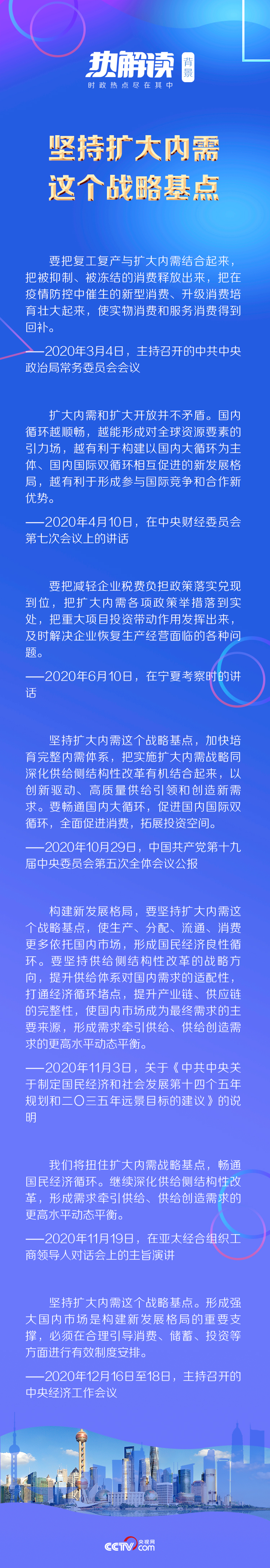 《熱解讀》梳理發(fā)現(xiàn),“擴(kuò)大內(nèi)需”一詞在今年的高層會議中被反復(fù)提及,3月4日召開的中共中央政治局常務(wù)委員會會議指出“要把復(fù)工復(fù)產(chǎn)與擴(kuò)大內(nèi)需結(jié)合起來,把被抑制、被凍結(jié)的消費(fèi)釋放出來”;9月8日,習(xí)近平總書記在全國抗擊新冠肺炎疫情表彰大會上強(qiáng)調(diào)“牢牢把握擴(kuò)大內(nèi)需這個(gè)戰(zhàn)略基點(diǎn),保護(hù)和激發(fā)市場主體活力”;黨的十九屆五中全會提出“堅(jiān)持?jǐn)U大內(nèi)需這個(gè)戰(zhàn)略基點(diǎn),加快培育完整內(nèi)需體系,把實(shí)施擴(kuò)大內(nèi)需戰(zhàn)略同深化供給側(cè)結(jié)構(gòu)性改革有機(jī)結(jié)合起來,以創(chuàng)新驅(qū)動、高質(zhì)量供給引領(lǐng)和創(chuàng)造新需求”……