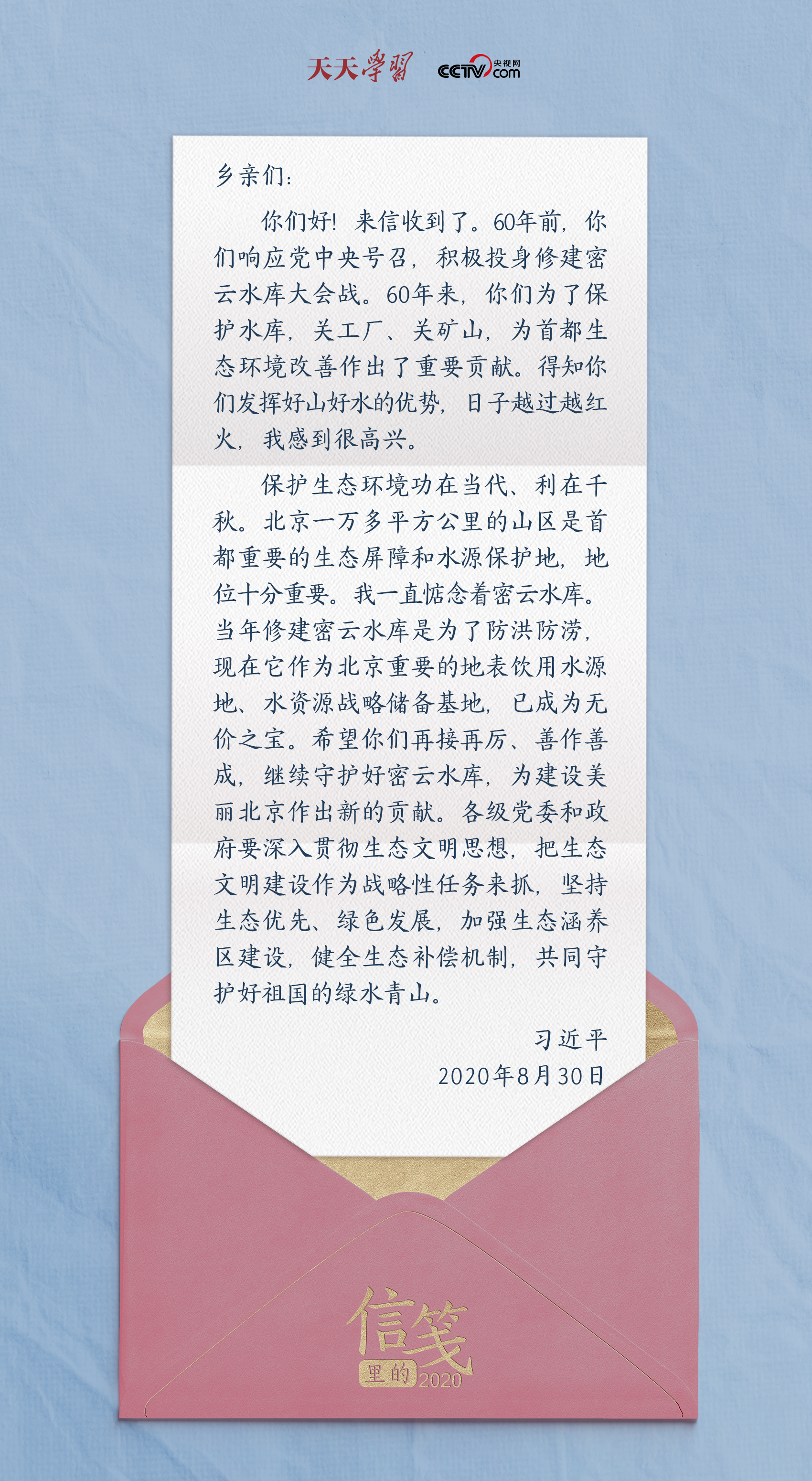 編者按:“云中誰寄錦書來”。2020這極不平凡的一年里,習近平總書記多次以書信的方式同人民群眾、黨員干部以及各行各業(yè)各界人士交流互動。一封封信箋,傳達關(guān)切、鼓勵與厚望,筆筆見真情,句句暖人心。歲末之際,央視網(wǎng)《天天學習》欄目推出年終策劃“信箋里的2020”,為您講述總書記回信背后的故事。