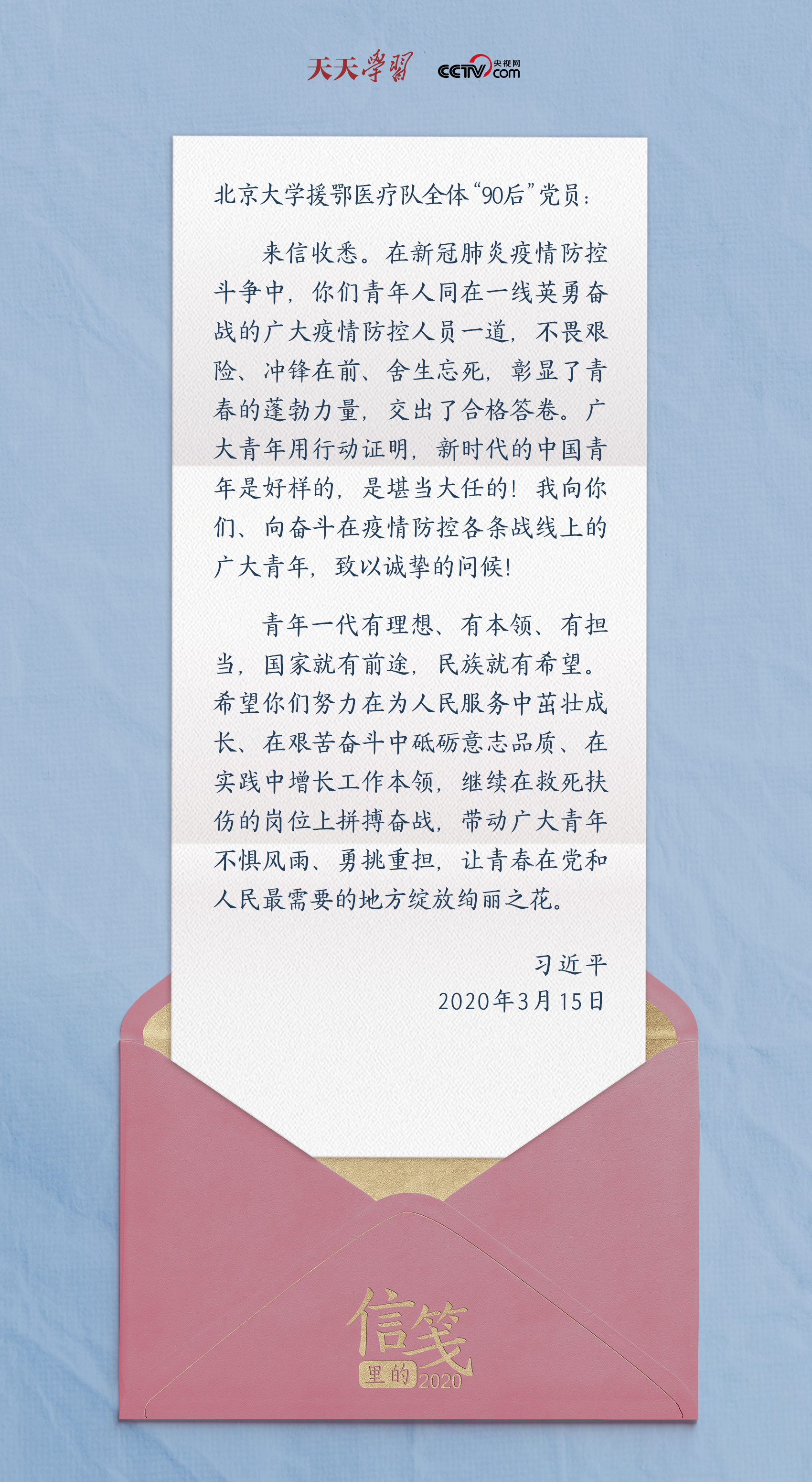 天天學(xué)習(xí)2020年3月11日,北京大學(xué)援鄂醫(yī)療隊(duì)北醫(yī)三院王奔和吳超兩位“90后”臨時(shí)黨支部書記,代表北京大學(xué)三家附屬醫(yī)院援鄂醫(yī)療隊(duì)的34名“90后”黨員給習(xí)近平總書記寫了一封信,表達(dá)了“90后”不怕吃苦、不怕?tīng)奚膱?jiān)定信心。