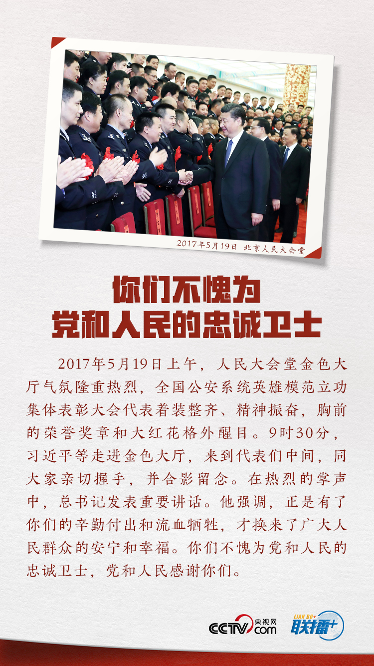 一直以來,習(xí)近平總書記對(duì)政法工作、對(duì)人民警察隊(duì)伍高度重視。黨的十八大以來,總書記多次會(huì)見全國公安系統(tǒng)的英模代表,多次到基層看望慰問人民警察,在不同場合多次表達(dá)對(duì)這支隊(duì)伍的關(guān)心關(guān)愛。央視網(wǎng)《聯(lián)播+》欄目特選取六幅珍貴畫面,結(jié)合總書記相關(guān)重要講話,為您展示人民領(lǐng)袖對(duì)人民警察的深情厚望。