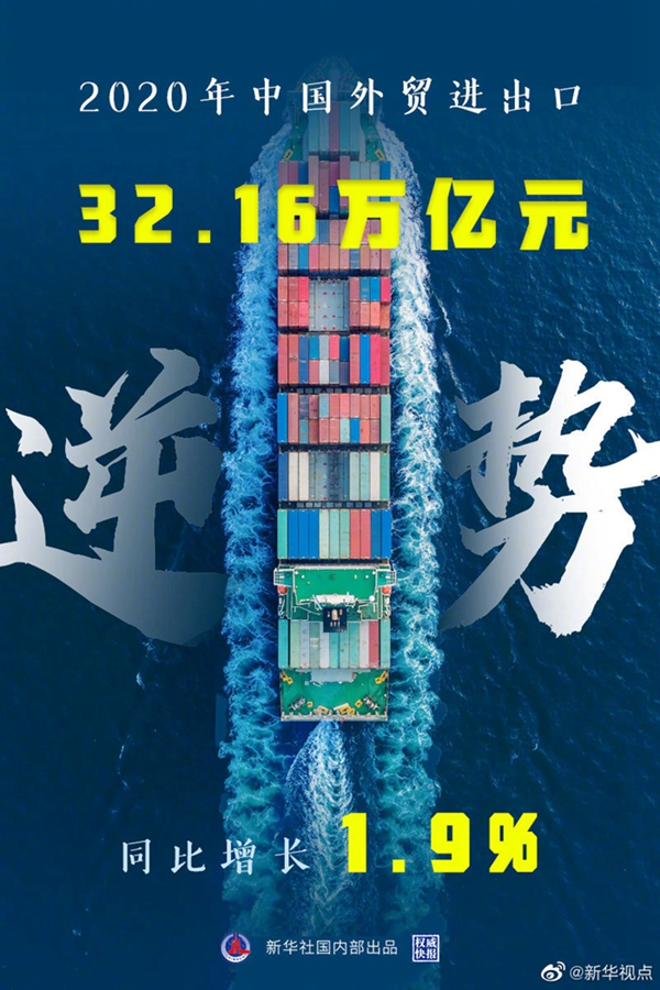 海關(guān)總署14日發(fā)布數(shù)據(jù),2020年我國貨物貿(mào)易進(jìn)出口總額 32.16萬億元,同比增長1.9%,中國外貿(mào)逆勢上揚(yáng)。(記者劉紅霞)