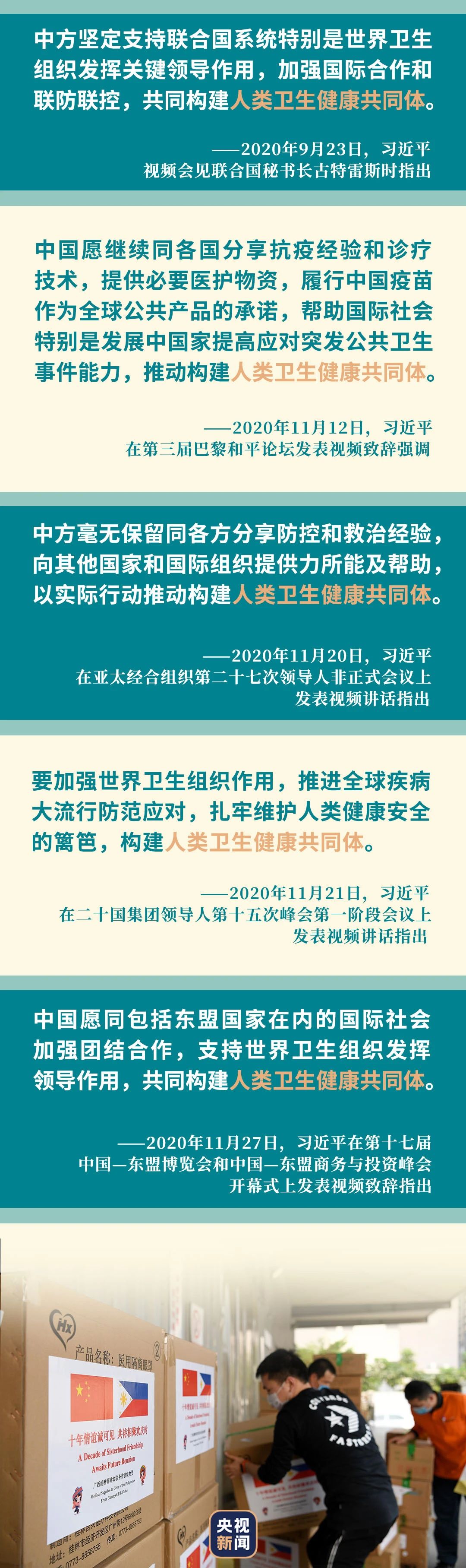 疫情發(fā)生以來,中國積極履行國際義務(wù),密切同世界衛(wèi)生組織和相關(guān)國家的友好合作,主動(dòng)同國際社會(huì)分享疫情和病毒信息、抗疫經(jīng)驗(yàn)做法。向150多個(gè)國家和10個(gè)國際組織提供抗疫援助,向34個(gè)國家派出36支醫(yī)療專家組,向各國提供2200多億只口罩、22.5億件防護(hù)服、10.2億份檢測試劑盒,加入“新冠肺炎疫苗實(shí)施計(jì)劃”,承諾將疫苗作為全球公共產(chǎn)品……中國履行國際義務(wù),發(fā)揮全球抗疫物資最大供應(yīng)國作用,共同構(gòu)建人類衛(wèi)生健康共同體。