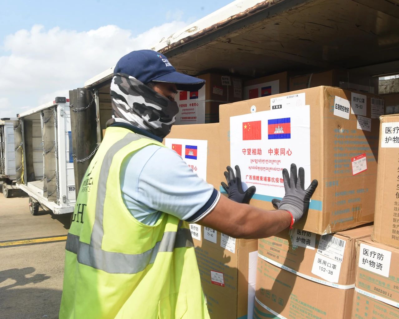 △2020年3月23日,一架搭載7名來自廣西壯族自治區(qū)醫(yī)療專家和一批防疫醫(yī)療物資的中國南航包機(jī)降落在柬埔寨首都金邊國際機(jī)場。