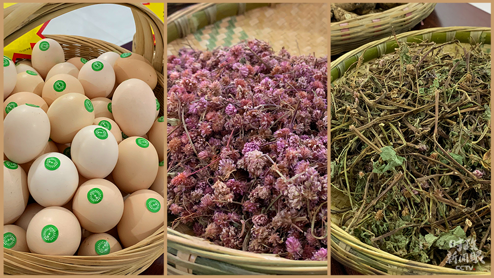 △化屋村走產(chǎn)業(yè)扶貧道路,發(fā)展特色種養(yǎng)殖業(yè)。這是土雞蛋和兩種頭花蓼花。(總臺(tái)央視記者郭晗光拍攝)