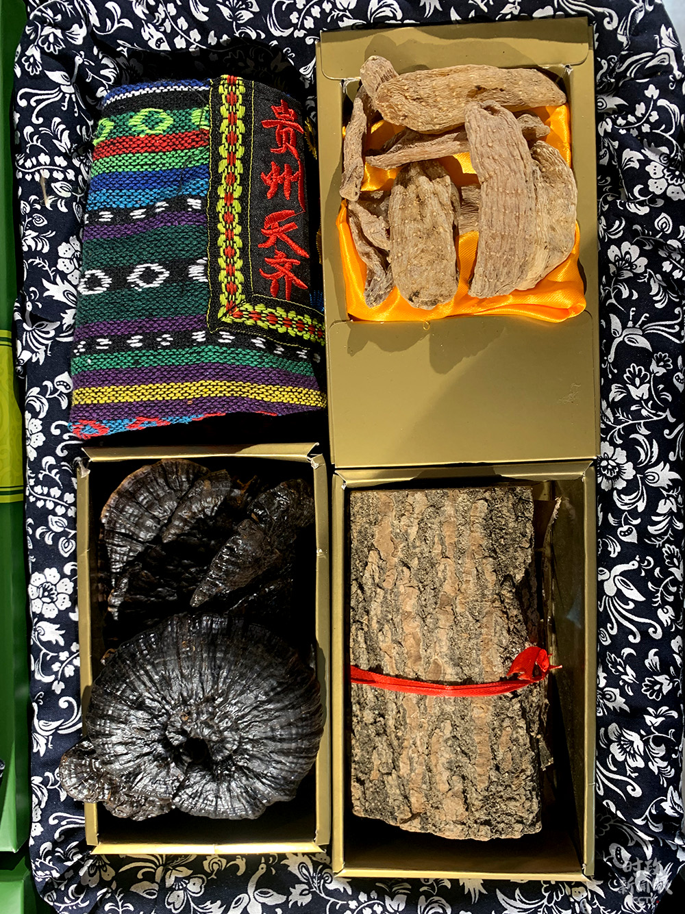 △貴州三寶,右上為天麻,下方分別是靈芝、杜仲。(總臺(tái)央視記者王鵬飛拍攝)