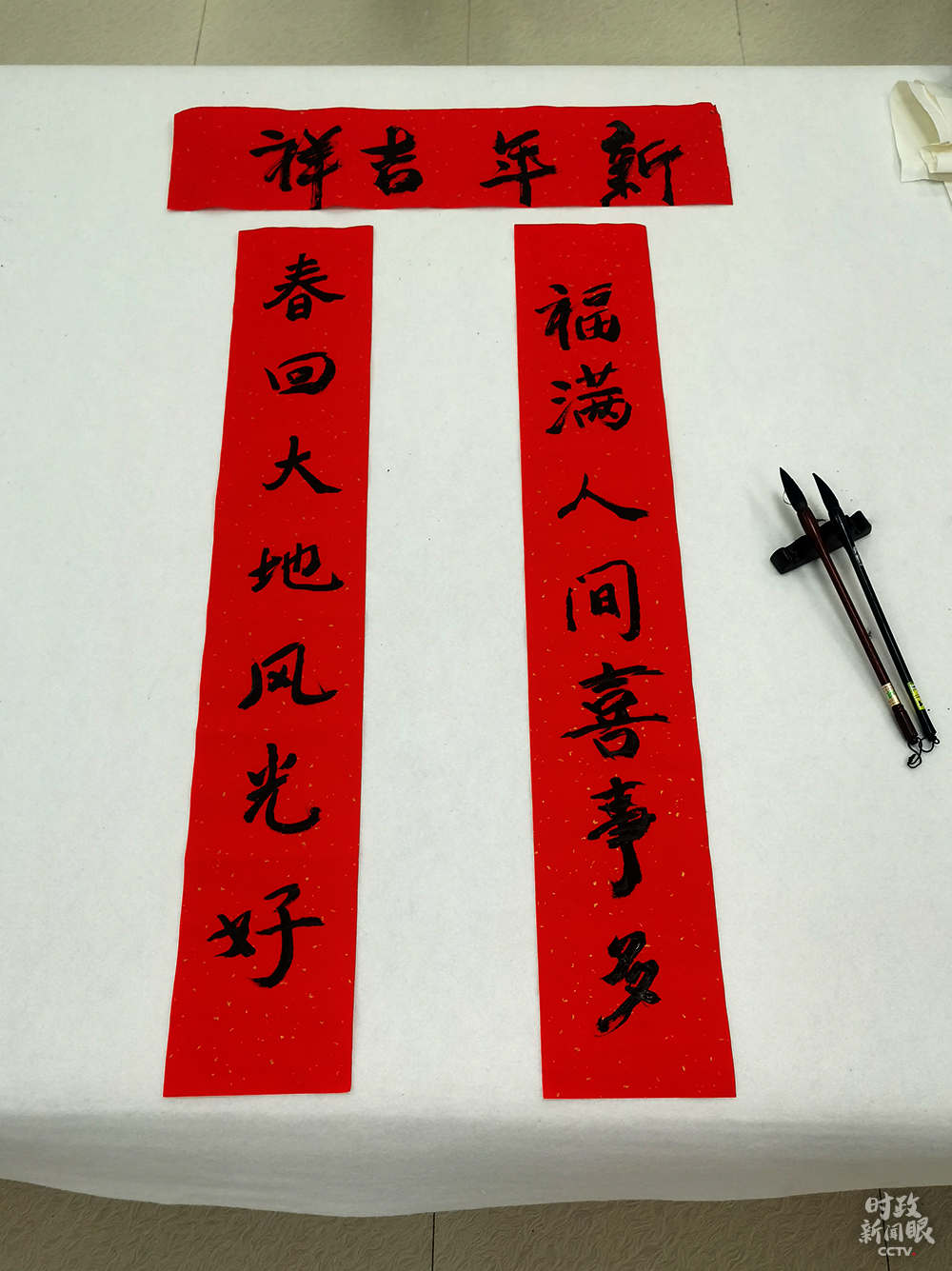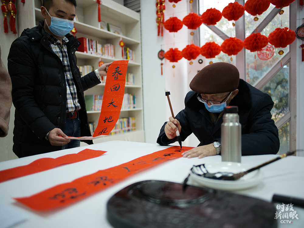 △84歲的社區(qū)居民戴世倫老先生,曾在貴州廣播電視大學(xué)任教。這是他寫的春聯(lián)。(總臺(tái)央視記者彭漢明、姚瑤拍攝)