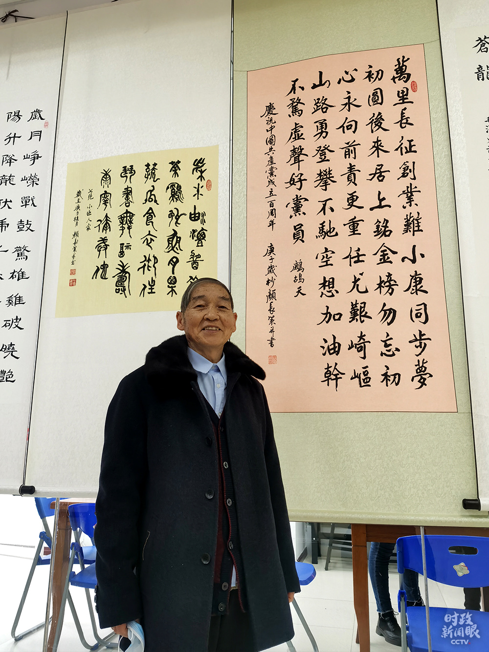 △這是87歲的社區(qū)居民顏長(zhǎng)策老先生為慶祝中國(guó)共產(chǎn)黨成立100周年創(chuàng)作并書寫的詩(shī)作。(總臺(tái)央視記者姚瑤拍攝)
