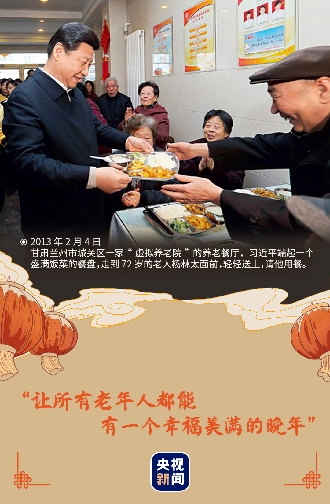 在各地考察中,習(xí)近平一次次走進(jìn)鄉(xiāng)村、社區(qū)、養(yǎng)老機(jī)構(gòu)和養(yǎng)老服務(wù)站,與老人們親切交流,叮囑要給予他們更多關(guān)心。在蘭州“虛擬養(yǎng)老院”的養(yǎng)老餐廳,總書記親自給老人遞飯菜;在北京四季青敬老院,總書記觀看老人作畫、手工制作、排練合唱等,祝福他們健康長(zhǎng)壽……