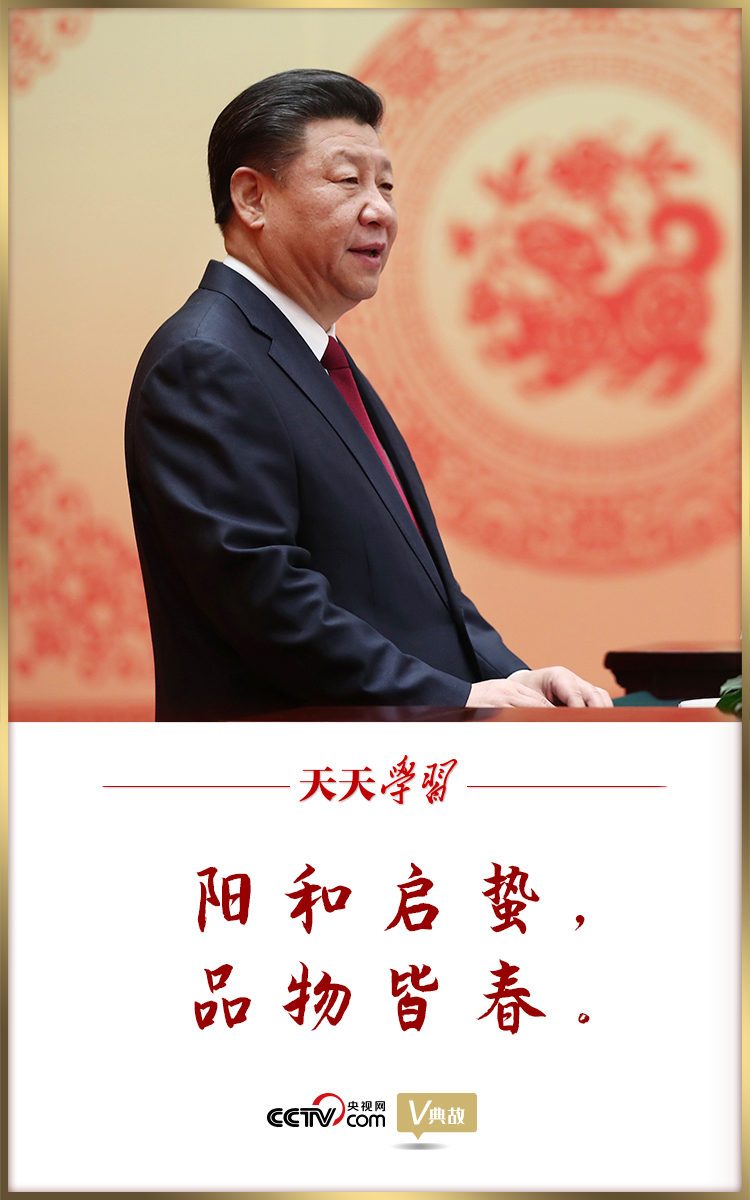2018年,祖國大地春來早,立春剛過,春節(jié)將臨。在春節(jié)團拜會上,習(xí)近平總書記在講話開場即引用“陽和啟蟄,品物皆春”這一名句,描繪了祖國大地春風(fēng)拂面、萬象更新的景象。