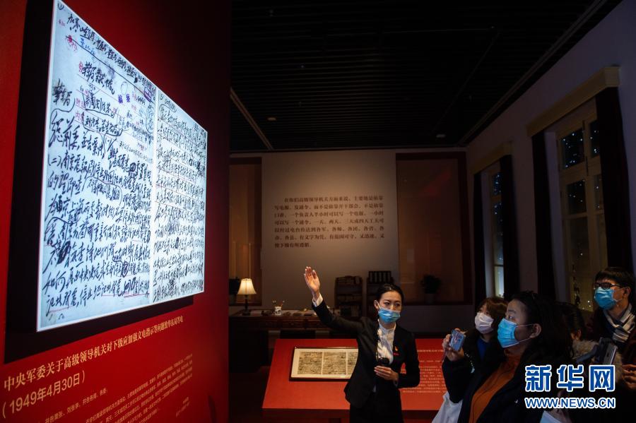 “毛澤東同志香山時期發(fā)布電報手稿專題展覽”在北京香山革命紀念館開展,講解員(左一)向媒體記者介紹電報內容(2020年12月16日攝)。新華社記者 陳鐘昊 攝