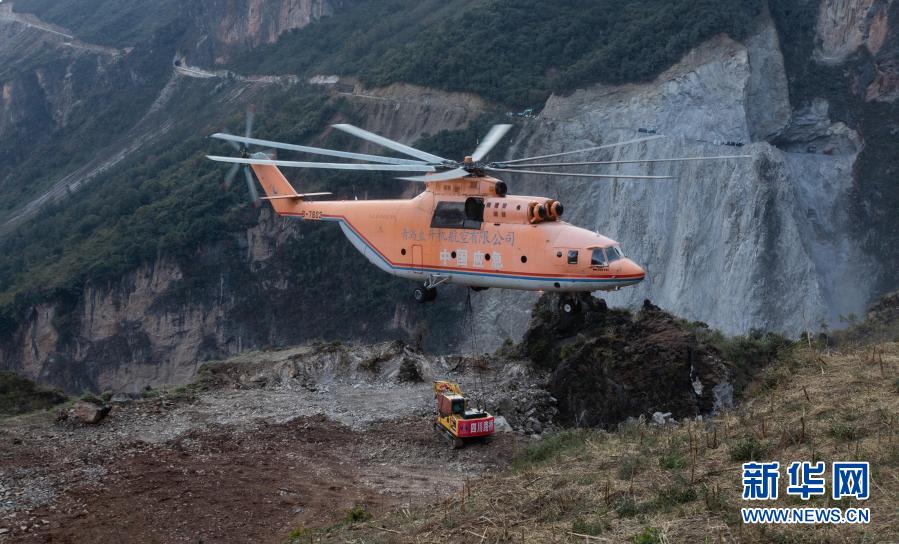 米-26重型直升機吊運一臺挖掘機抵達四川省布拖縣阿布洛哈村上空準備降落(2019年12月5日攝)。為了打通四川省布拖縣阿布洛哈通村公路,施工單位租用的一架米-26重型直升機克服高山峽谷、天氣多變等不利因素,從布拖縣城吊運大型施工設(shè)備到阿布洛哈村,為兩邊分頭掘進施工提供大型機械保障。新華社記者 江宏景 攝