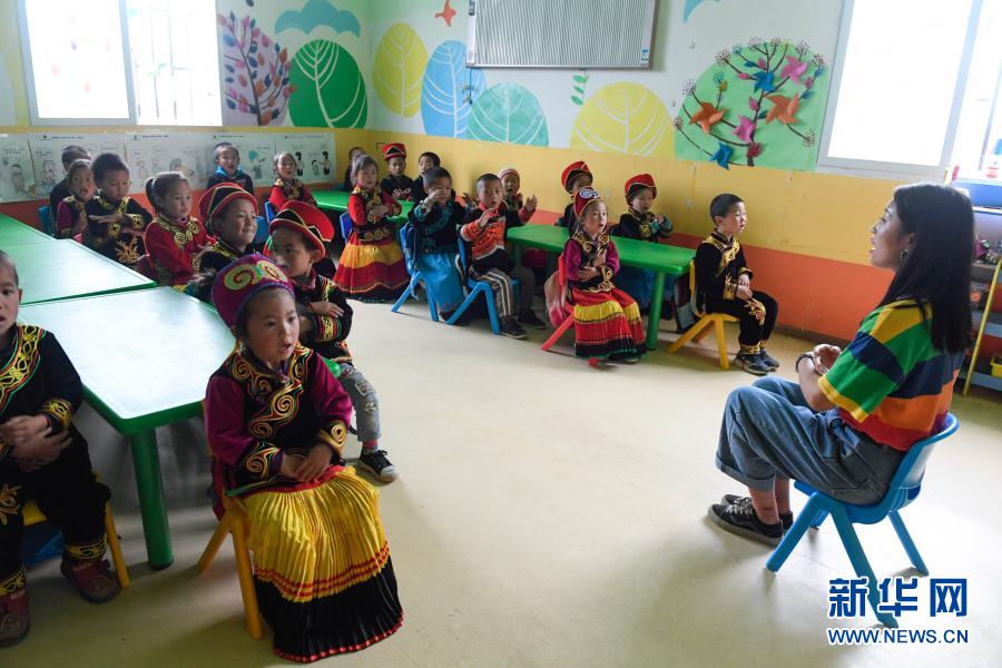 在四川省雷波縣莫紅鄉(xiāng)三峽新村幼兒園,老師教孩子們用普通話唱歌(2019年5月14日攝)。新華社記者 江宏景 攝