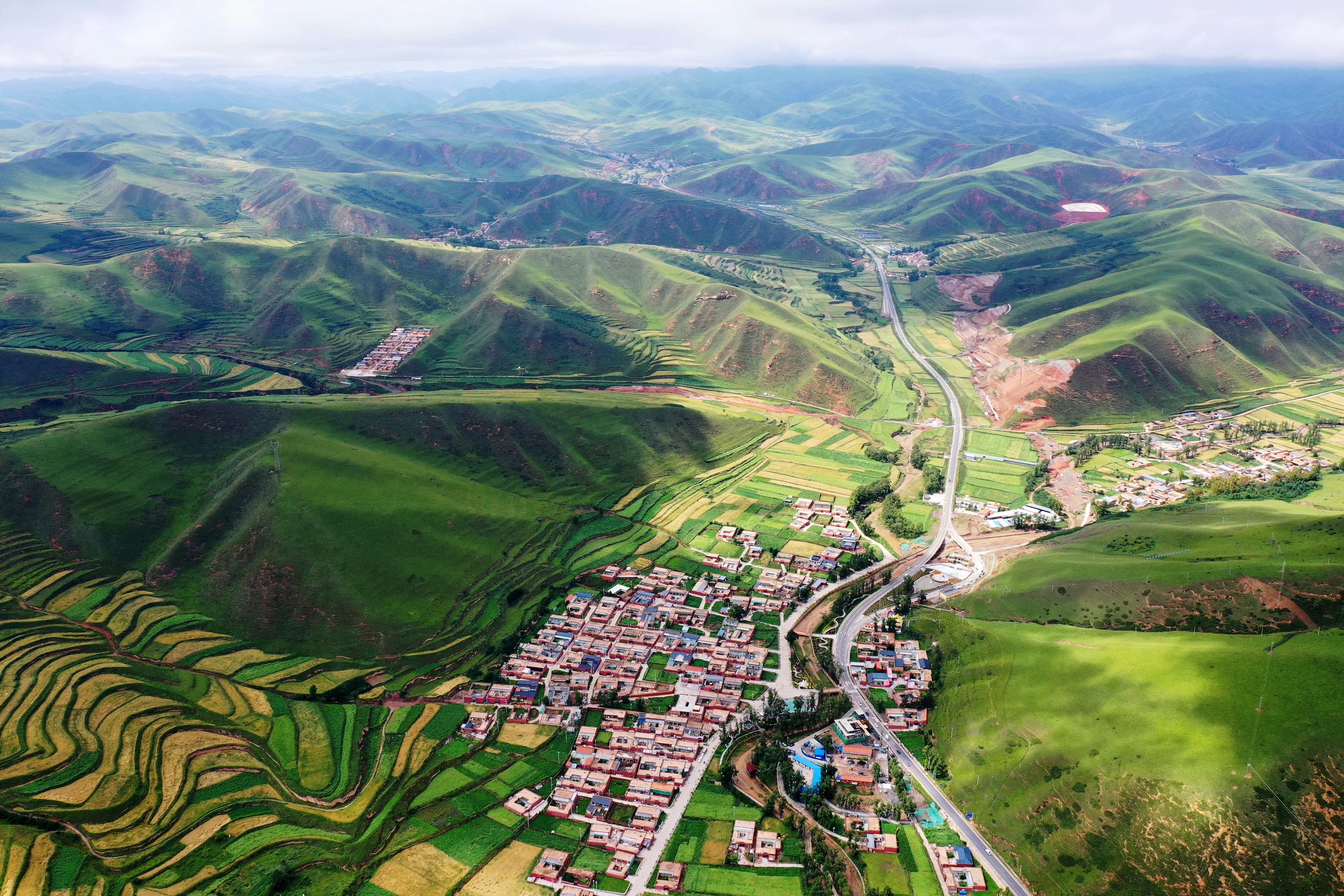 這是2020年8月12日拍攝的甘肅省甘南藏族自治州卓尼縣阿子灘鎮(zhèn)阿子灘村(無人機(jī)照片)。新華社記者 邢廣利 攝