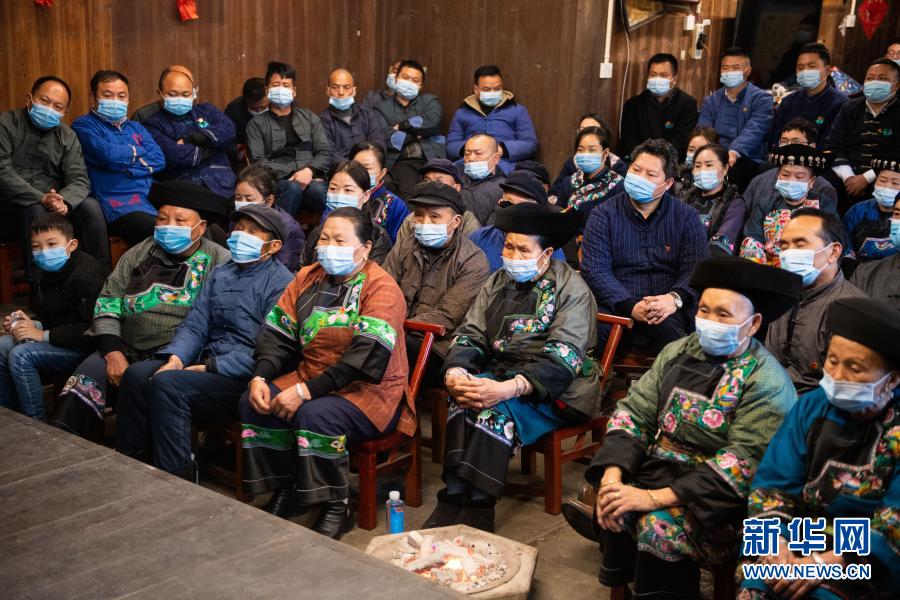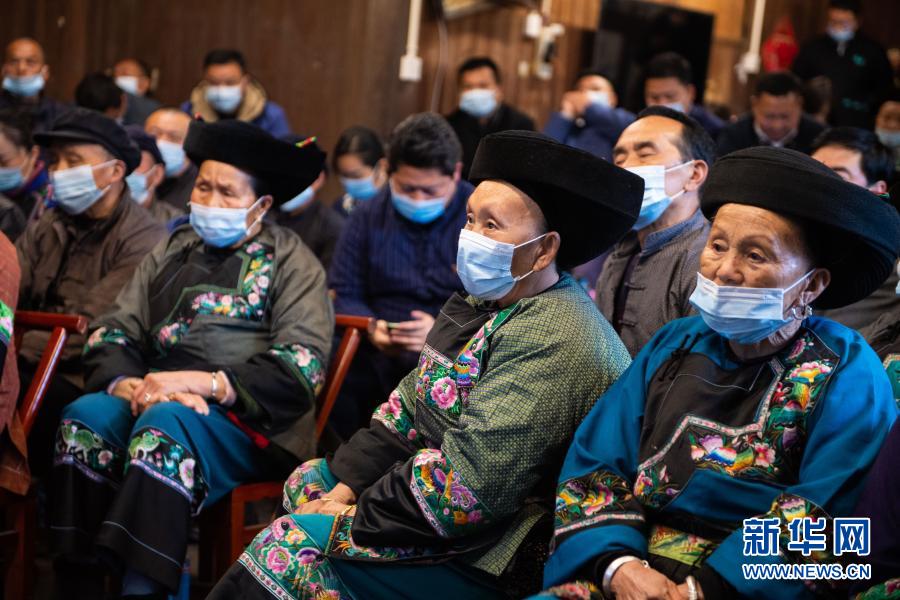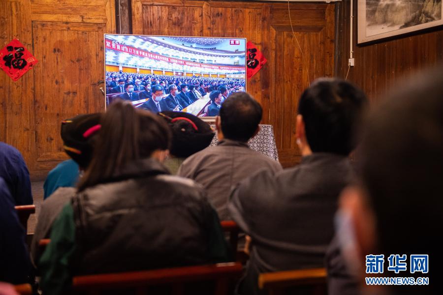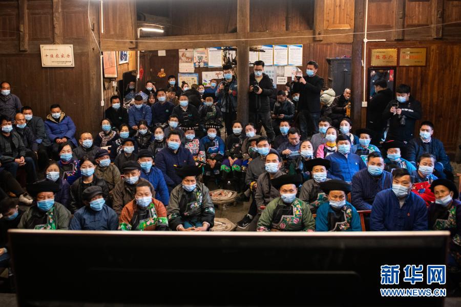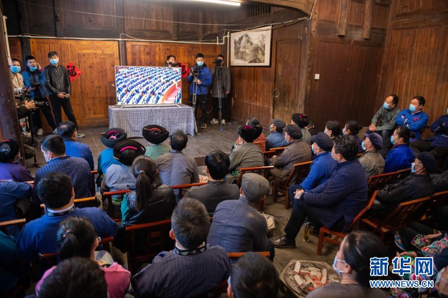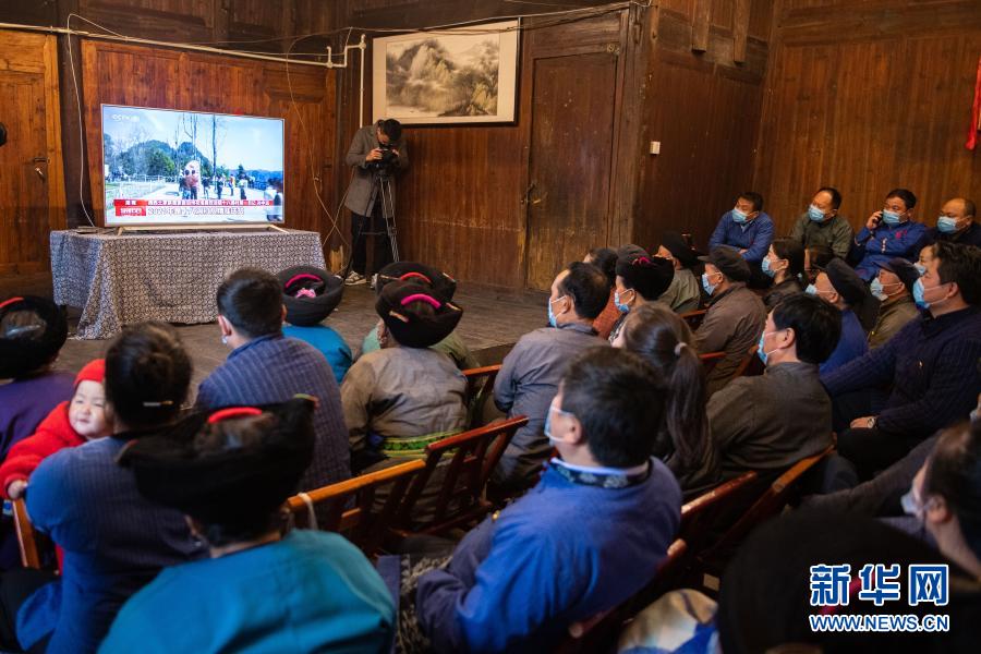 2月25日上午,在湖南省湘西土家族苗族自治州花垣縣十八洞村,當(dāng)?shù)馗刹俊⑷罕娫谝粦舸迕窦沂湛慈珖?guó)脫貧攻堅(jiān)總結(jié)表彰大會(huì)直播。新華社記者 陳思汗 攝