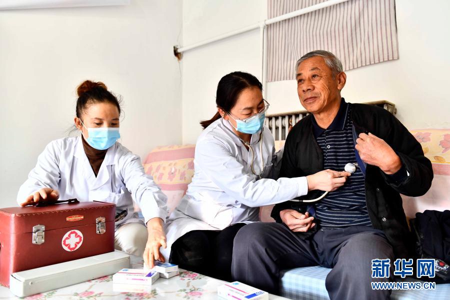 2020年11月11日,在山東省濰坊市寒亭區(qū)寒亭街道東院社區(qū),衛(wèi)生室醫(yī)生王紅霞(中)為村民張勇臣看病。寒亭區(qū)探索實施醫(yī)保服務(wù)下沉舉措,構(gòu)建起覆蓋全區(qū)基層醫(yī)療機構(gòu)的醫(yī)保服務(wù)下沉網(wǎng)絡(luò),讓群眾在家門口便捷地享受醫(yī)保紅利。新華社記者 郭緒雷 攝