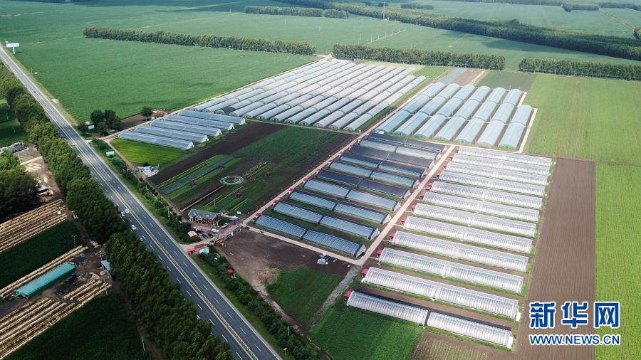 帶動脫貧戶就業(yè)的黑龍江省肇東市黎明鎮(zhèn)甜嫂創(chuàng)意休閑農(nóng)業(yè)園區(qū)全貌(無人機(jī)照片,2020年7月6日攝)。新華社記者 王建威 攝