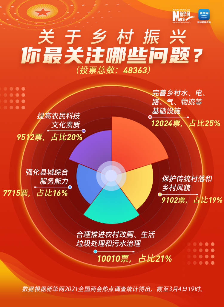 其中,“完善鄉(xiāng)村水、電、路、氣、物流等基礎(chǔ)設(shè)施”、“合理推進(jìn)農(nóng)村改廁、生活垃圾處理和污水治理”、“提高農(nóng)民科技文化素質(zhì)”位列子選項(xiàng)前三位,成為大家關(guān)注的焦點(diǎn)。如何推進(jìn)更多、更具體的鄉(xiāng)村振興支持政策,如何突破戶籍制度等領(lǐng)域改革,如何完善城鄉(xiāng)一體化發(fā)展的體制機(jī)制、推動(dòng)農(nóng)業(yè)農(nóng)村現(xiàn)代化邁好“十四五”第一步,成為代表委員的重要關(guān)切。