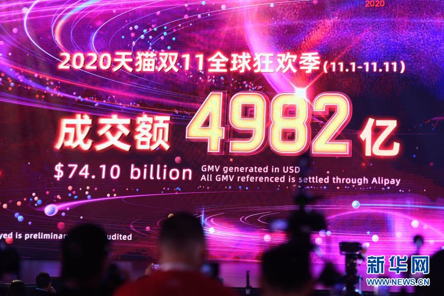 在浙江杭州未來科技城學(xué)術(shù)交流中心,大屏幕顯示阿里巴巴旗下天貓“雙11”成交額超過4982億元(2020年11月12日攝)。新華社記者 黃宗治 攝