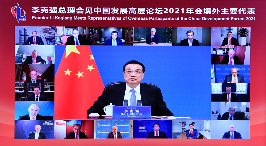 國(guó)務(wù)院總理李克強(qiáng)3月22日晚在人民大會(huì)堂以視頻方式會(huì)見(jiàn)出席中國(guó)發(fā)展高層論壇2021年年會(huì)的境外代表。來(lái)自世界五百?gòu)?qiáng)企業(yè)的負(fù)責(zé)人、國(guó)際知名學(xué)術(shù)研究機(jī)構(gòu)的專(zhuān)家學(xué)者和主要國(guó)際組織代表等參加。