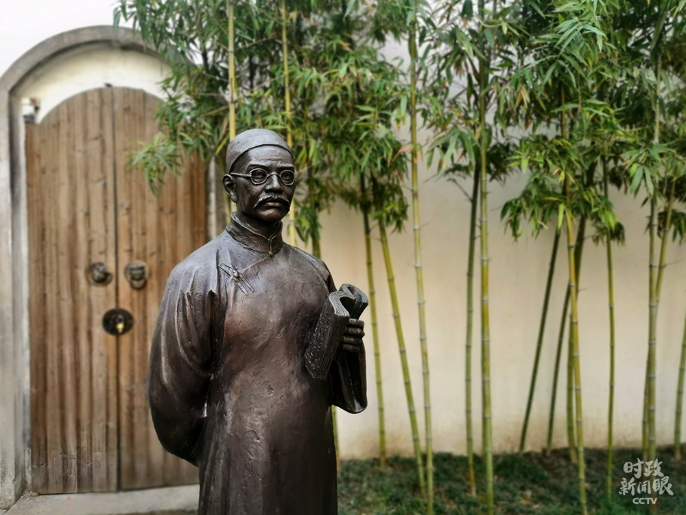 △嚴(yán)復(fù)故居中,嚴(yán)復(fù)雕像手中所拿的是《天演論》。(總臺(tái)央視記者張宇、覃思拍攝)