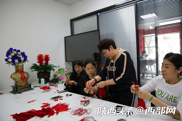 延安市寶塔區(qū)電商直播融合孵化服務(wù)中心,60歲的退休大媽董智玲在教大家做絲網(wǎng)花,她們做著山丹丹花,唱著《山丹丹花開紅艷艷》,到這里來學(xué)手工花的制作成了一件快樂的事。