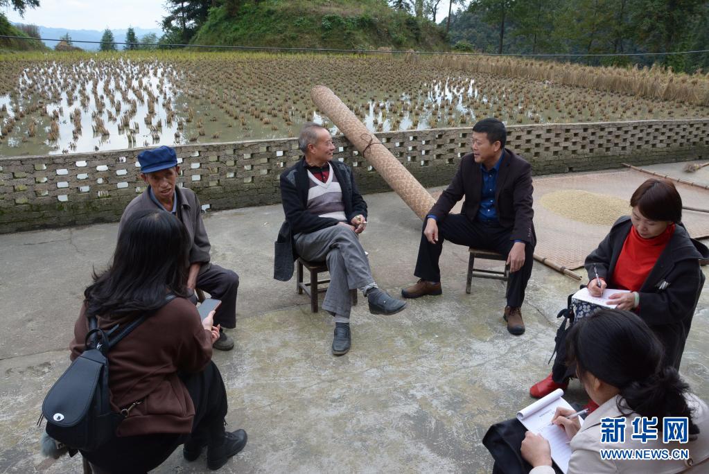 于都縣革命烈士紀(jì)念館館員在貴州省黃平縣采訪于都籍失散紅軍鐘興明(又名鐘元享)的女婿張禮平(左三)(資料照片)。新華社發(fā)(于都縣革命烈士紀(jì)念館供圖)