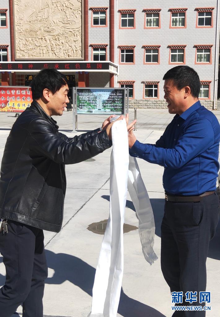 臘子口戰(zhàn)役紀(jì)念館工作人員向于都縣革命烈士紀(jì)念館館長(zhǎng)黃發(fā)斌(右)等人獻(xiàn)上哈達(dá)(資料照片)。新華社發(fā)(于都縣革命烈士紀(jì)念館供圖)