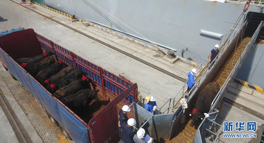 裝載來自澳大利亞的進(jìn)口活牛貨船抵達(dá)海南馬村港后,工作人員在接卸活牛(2020年7月3日攝,無人機照片)。新華社記者 楊冠宇 攝