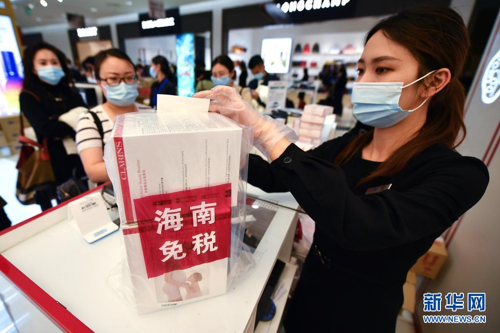1月7日,海口日月廣場免稅店的工作人員在打包免稅品。新華社記者 郭程 攝