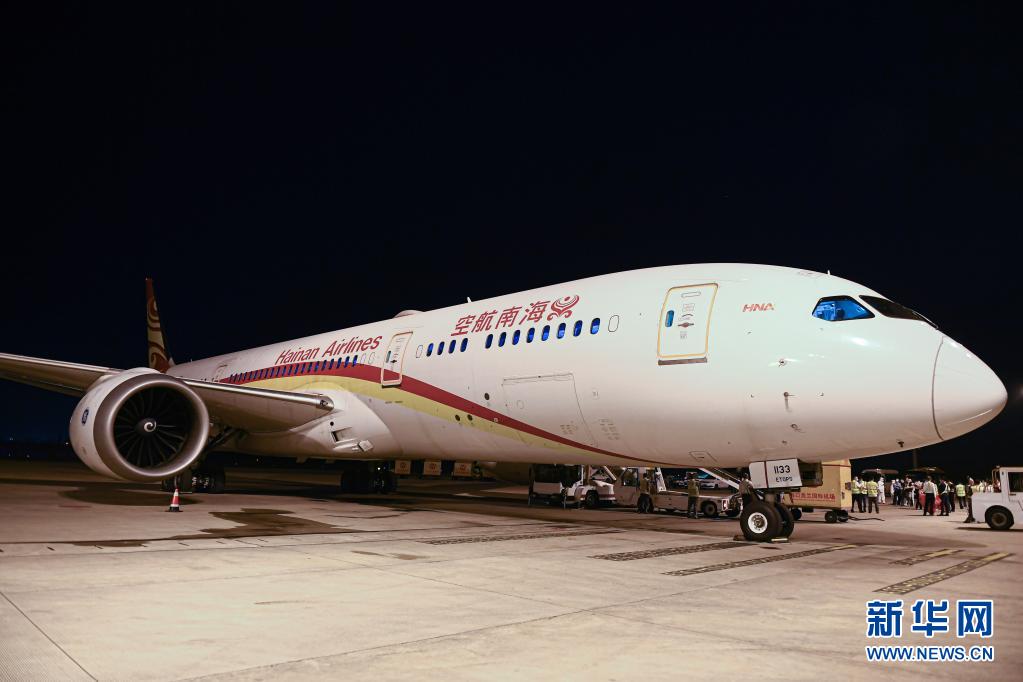 這是3月26日在??诿捞m國際機場拍攝的海南航空HU787航班。3月27日凌晨,該航班搭載貨物從??陲w往法國巴黎,海南自貿(mào)港首條定期洲際貨運航線正式開通。新華社記者 蒲曉旭 攝