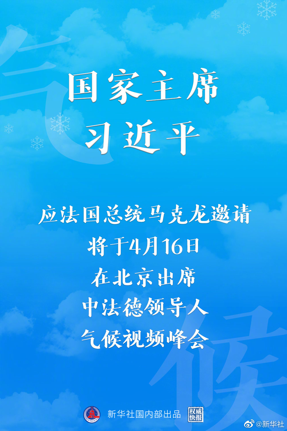 外交部發(fā)言人華春瑩15日宣布:應(yīng)法國(guó)總統(tǒng)馬克龍邀請(qǐng),國(guó)家主席習(xí)近平將于4月16日在北京出席中法德領(lǐng)導(dǎo)人氣候視頻峰會(huì)。 ​​​​