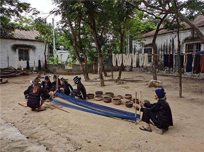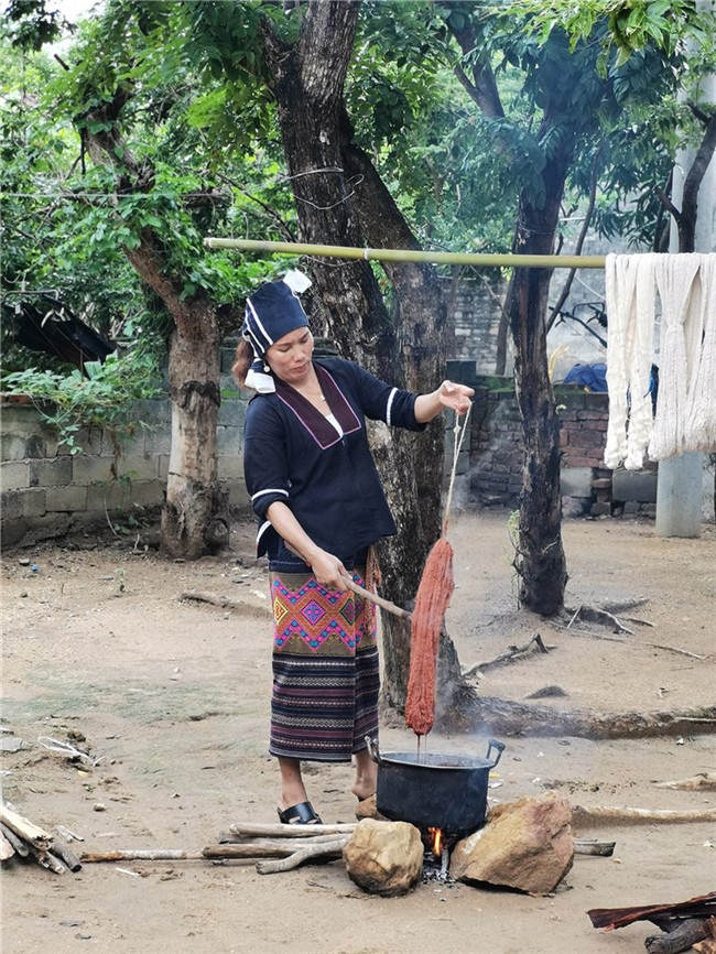 在確定復(fù)制參照物后,馬上組織開(kāi)始織造工作。龍被技藝恢復(fù)織造過(guò)程,前后涉及6支團(tuán)隊(duì),近100人。在數(shù)月的復(fù)制過(guò)程中,遇到的困難重重,手工棉紡線的緊缺,植物染色原材料由于季節(jié)天氣、種植不足等因素產(chǎn)生的緊缺,織造設(shè)備的問(wèn)題,都對(duì)復(fù)制過(guò)程產(chǎn)生較大影響,同時(shí)也是技藝恢復(fù)中有待恢復(fù)的重要組成。在織造中,試錯(cuò)的情況也屢屢發(fā)生。“最終,我們克服了所有問(wèn)題,終于使得龍被紡、染、織、繡技藝得以恢復(fù)。”說(shuō)起這段過(guò)往,郭凱印象深刻。