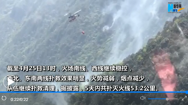截至4月25日13時,火場南線、西線繼續(xù)穩(wěn)控,西北、東南兩線撲救效果明顯,火勢減弱,煙點減少,隊伍繼續(xù)撲救清理,據(jù)披露,5天內(nèi)共撲滅火線53.2公里,撲打明火77處,清理煙點2382處。