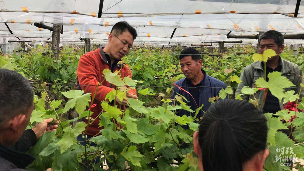 △鄭吉祥(左二)是桂林市農(nóng)業(yè)農(nóng)村局技術(shù)員,當(dāng)天他在葡萄園為總書記作介紹。(總臺央視記者許達(dá)拍攝)